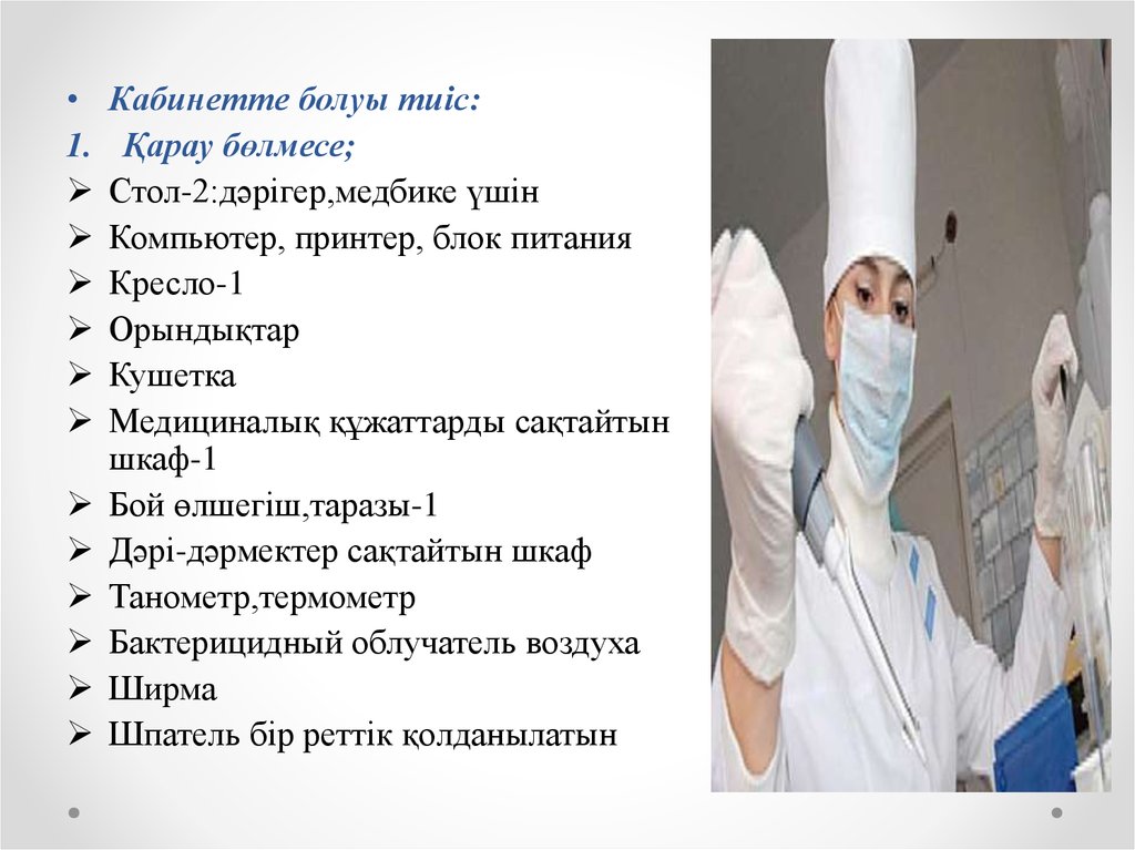 тұруы тиіс: 1 науқасты қарау бөлмесі,2 процедура