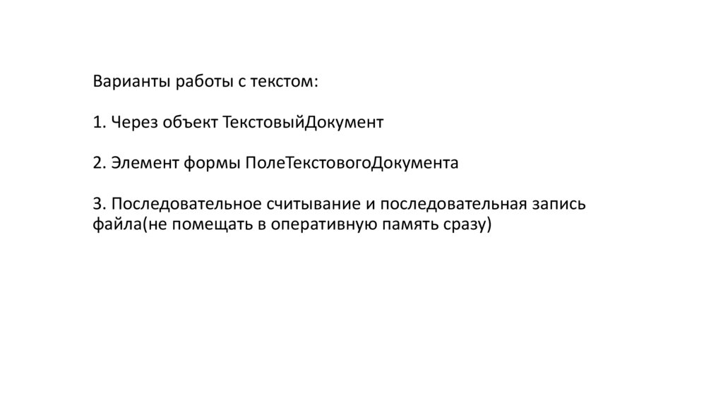 Варианты работы с текстом:1. Через объект ТекстовыйДокумент