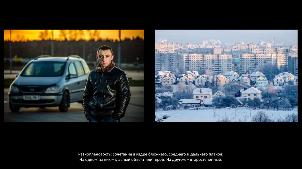 Разноплановость: сочетание в кадре ближнего, среднего и дальнего планов.На одном из них – главный объект или герой. На другом – второстепенный.