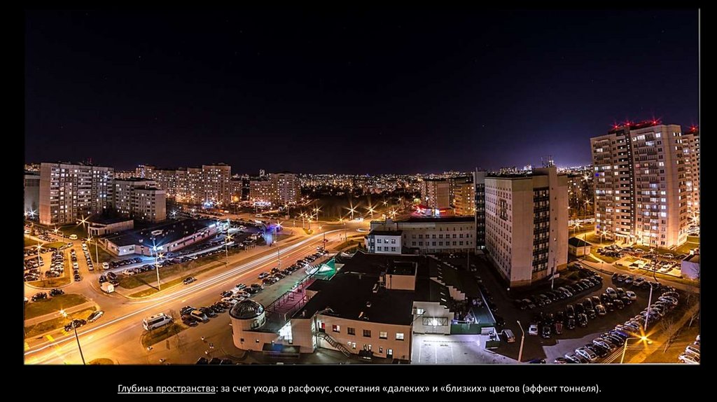 Глубина пространства: за счет ухода в расфокус, сочетания «далеких» и «близких» цветов (эффект тоннеля).15.