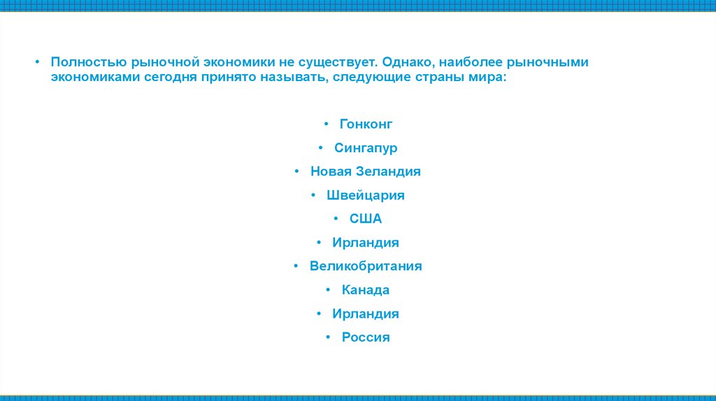 • Полностью рыночной экономики не существует. Однако, наиболее рыночнымиэкономиками сегодня принято называть, следующие страны мира:
