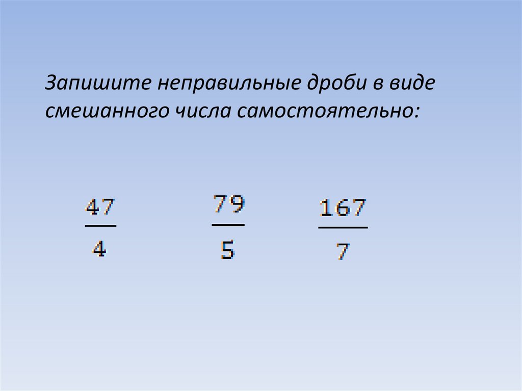 Запишите неправильные дроби в видесмешанного числа самостоятельно: