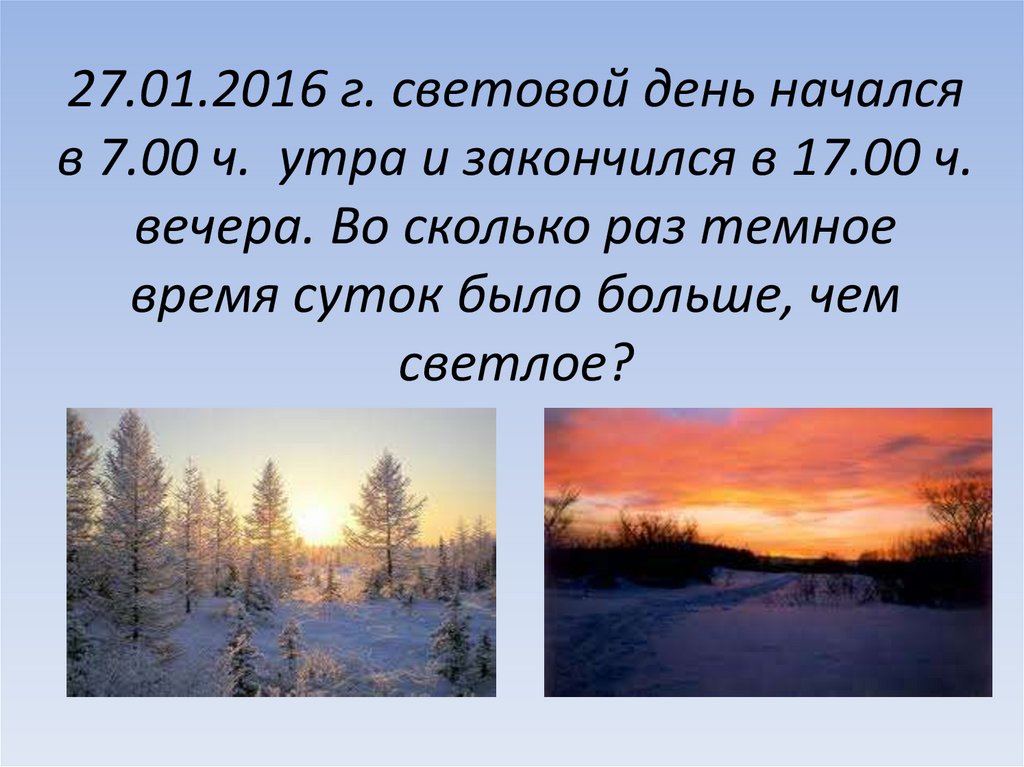 27.01.2016 г. световой день началсяв 7.00 ч. утра и закончился в 17.00 ч.
