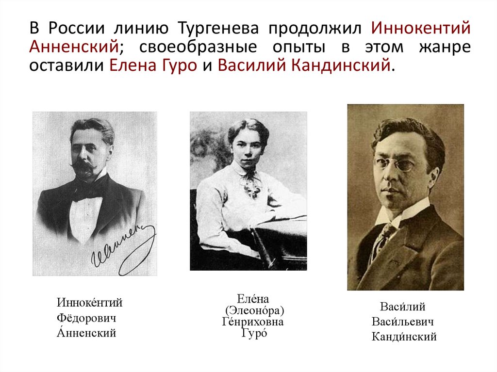 В России линию Тургенева продолжил ИннокентийАнненский; своеобразные опыты в этом жанре