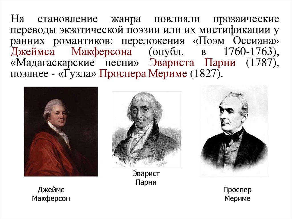 На становление жанра повлияли прозаическиепереводы экзотической поэзии или их мистификации у