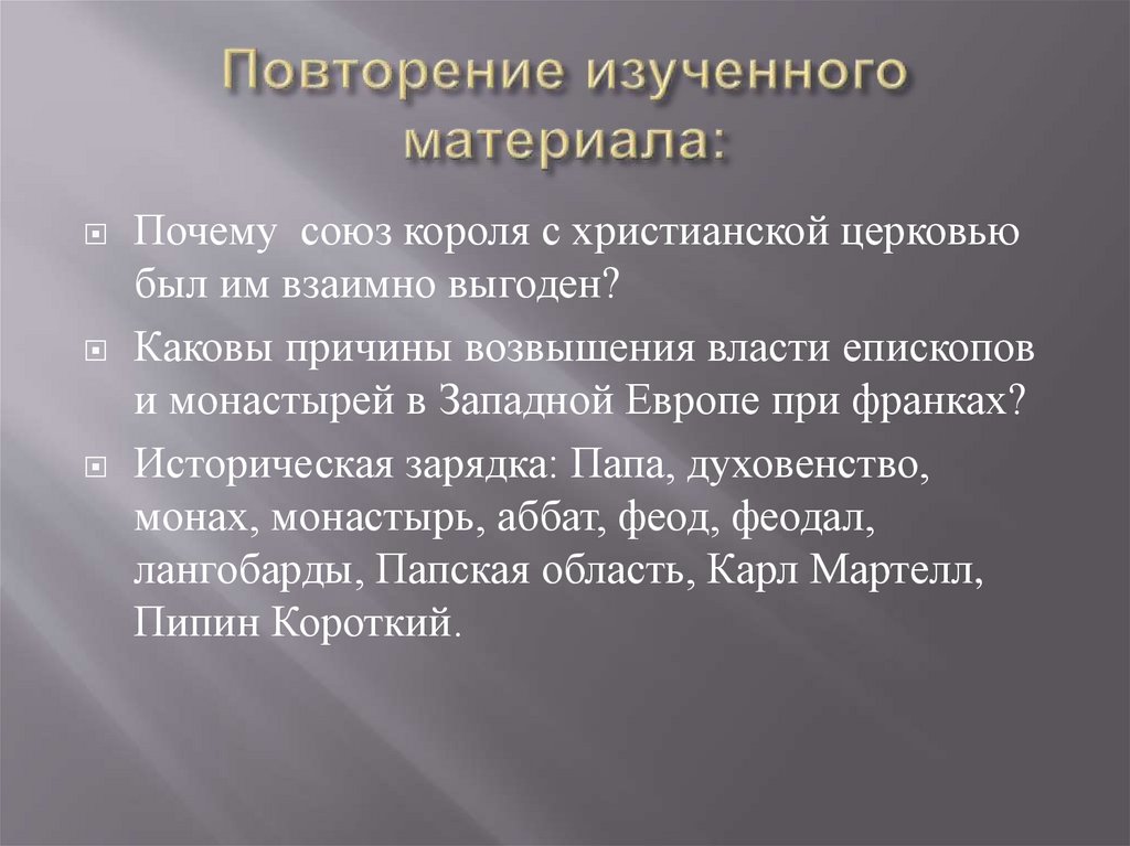 Повторение изученного по теме: «Христианскаяцерковь и королевство франков в VI-VIII вв.»