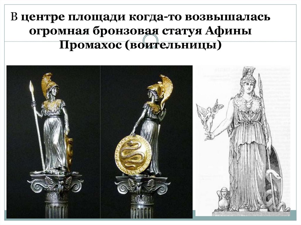 В центре площади когда-то возвышаласьогромная бронзовая статуя Афины