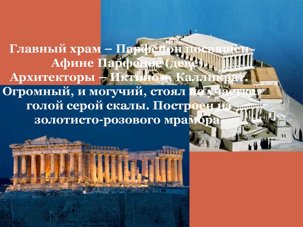 Главный храм – Парфенон посвященАфине Парфенос (деве).