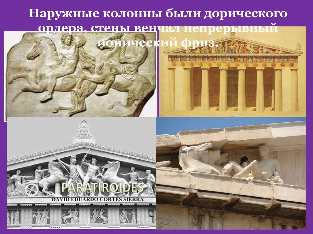 Наружные колонны были дорическогоордера, стены венчал непрерывный