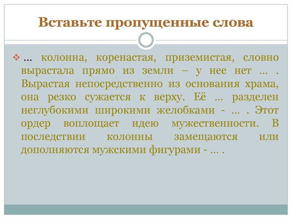 Вставьте пропущенные слова… колонна, коренастая, приземистая, словно