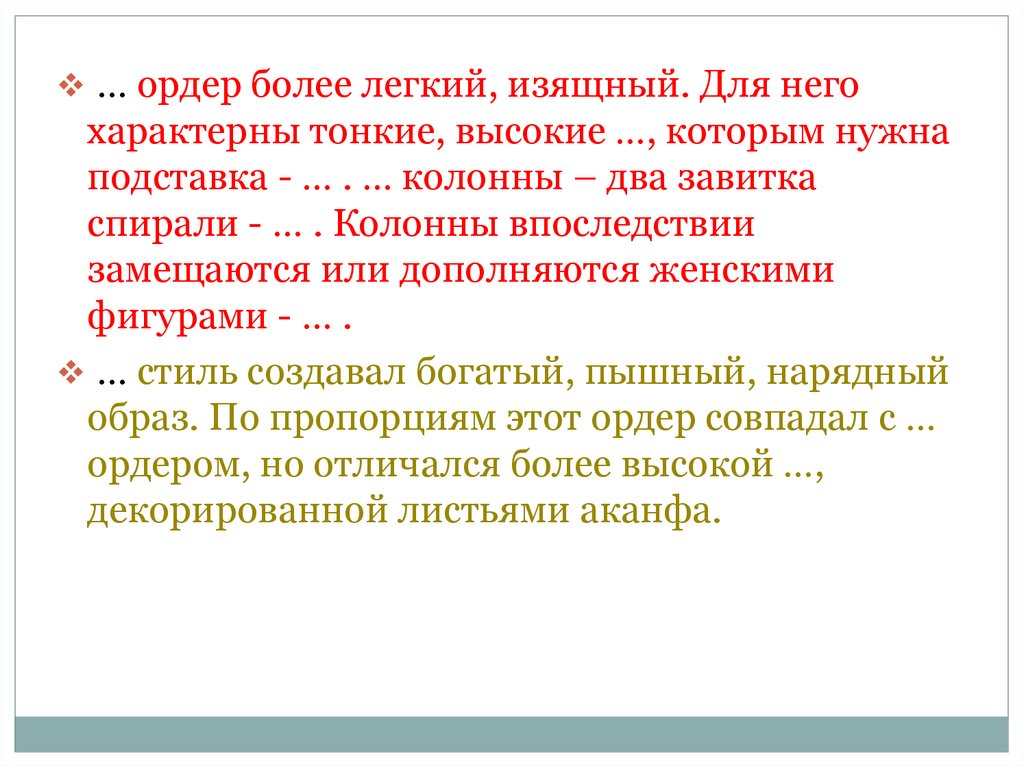 … ордер более легкий, изящный. Для негохарактерны тонкие, высокие …, которым нужна