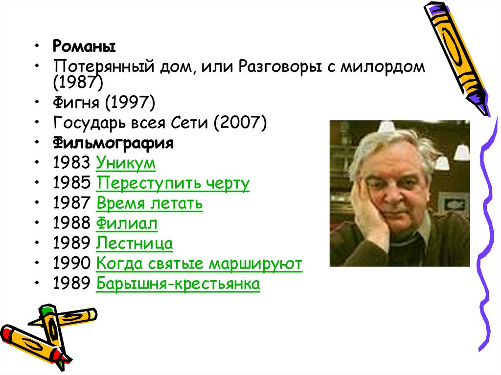 Автор сценариев 7-ми художественных фильмов, выпущенных на