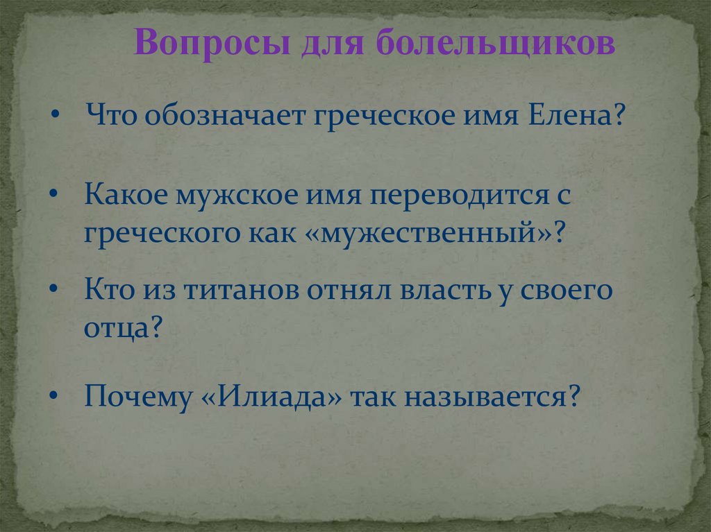 Вопросы для болельщиков• Что обозначает греческое имя Елена?