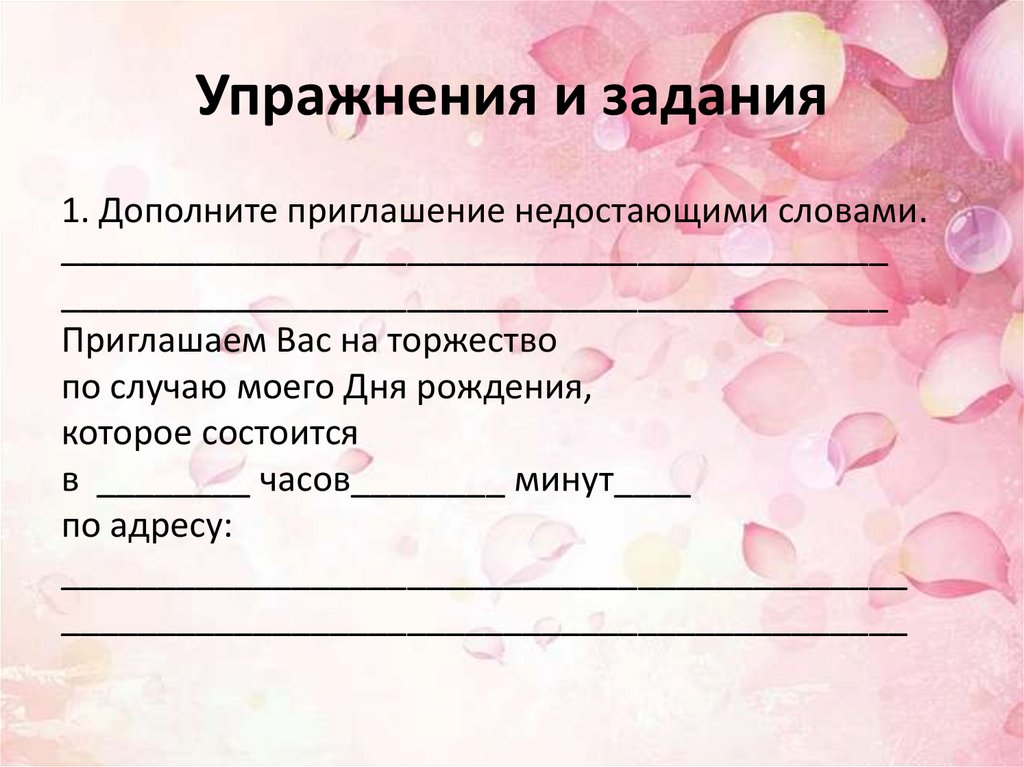 Упражнения и задания1. Дополните приглашение недостающими словами.