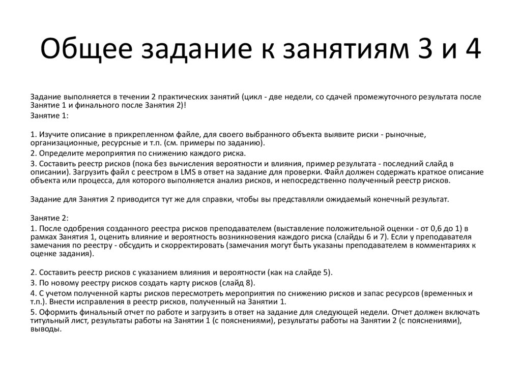 рамках Занятия 1, оценить влияние и вероятность возникновения каждого риска (слайды 6 и 7). Если у преподавателя