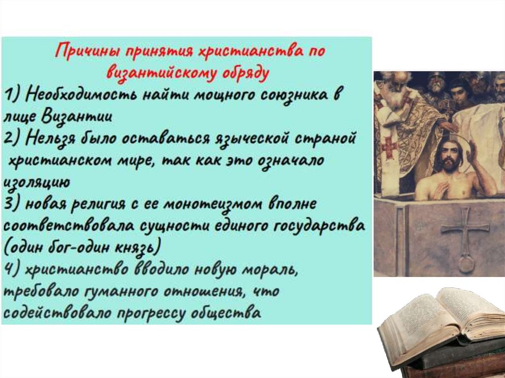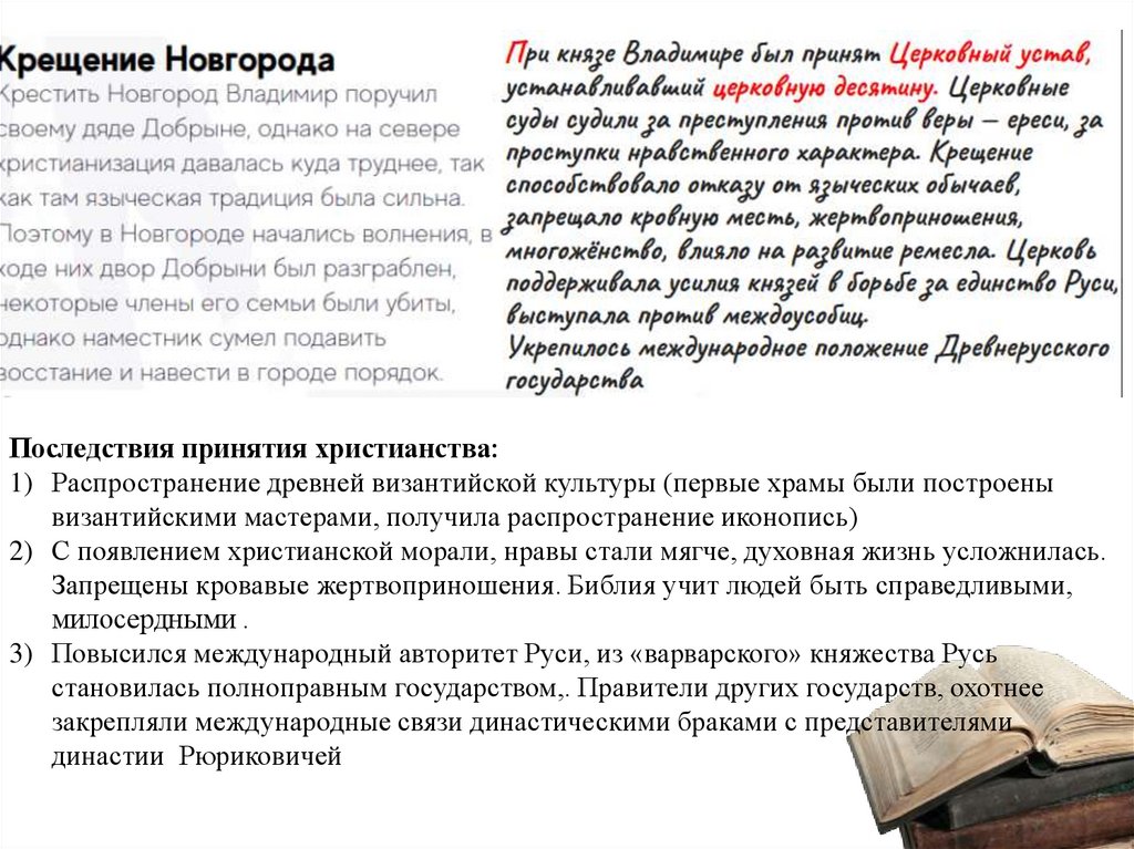 Последствия принятия христианства:1) Распространение древней византийской культуры (первые храмы были построены