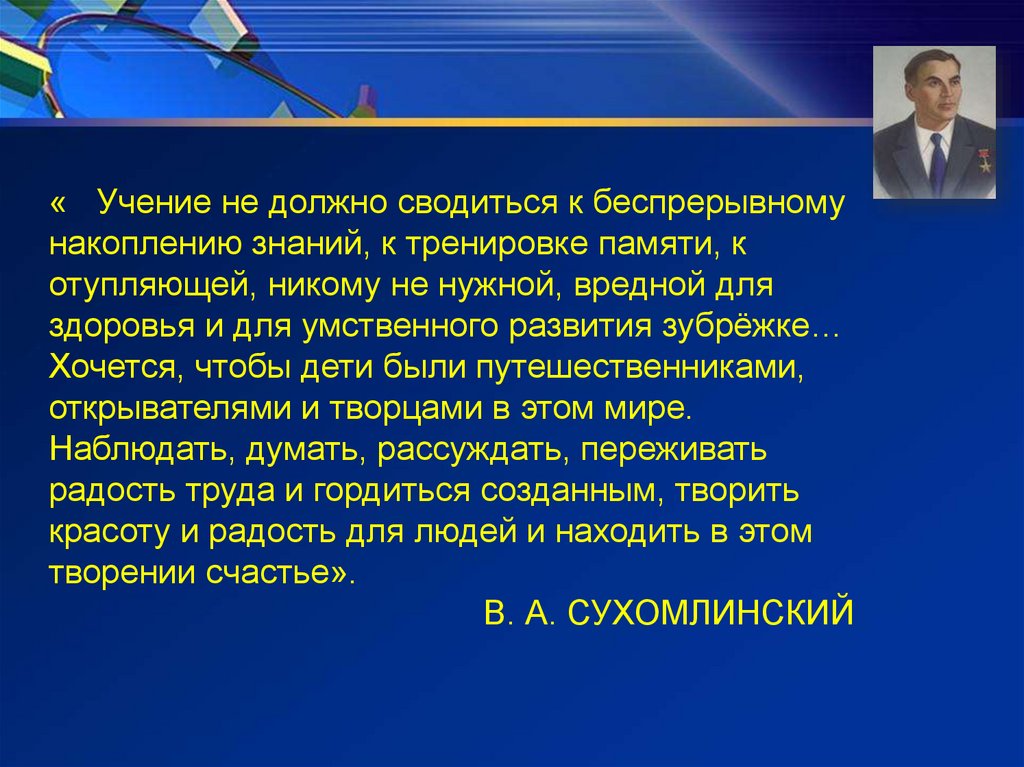 « Учение не должно сводиться к беспрерывномунакоплению знаний, к тренировке памяти, к
