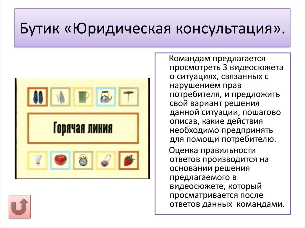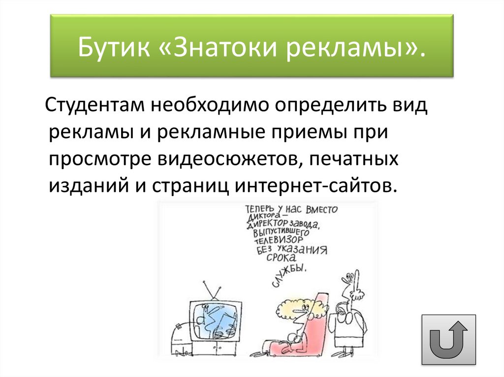 Бутик «Знатоки рекламы».Студентам необходимо определить вид