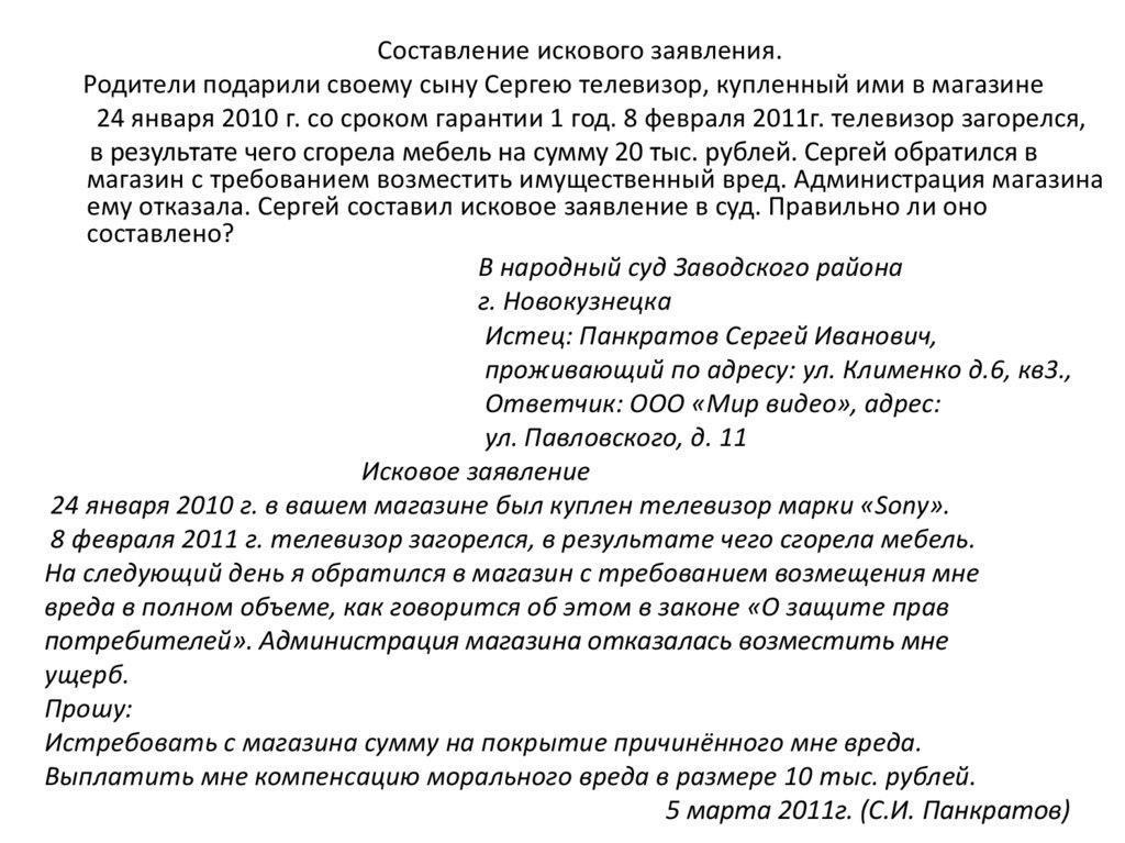 Составление искового заявления.Родители подарили своему сыну Сергею телевизор, купленный ими в магазине
