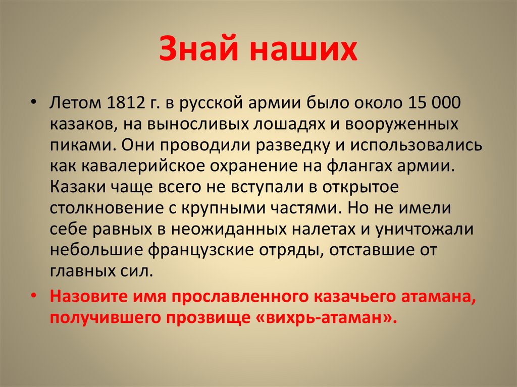 Знай наших• Летом 1812 г. в русской армии было около 15 000