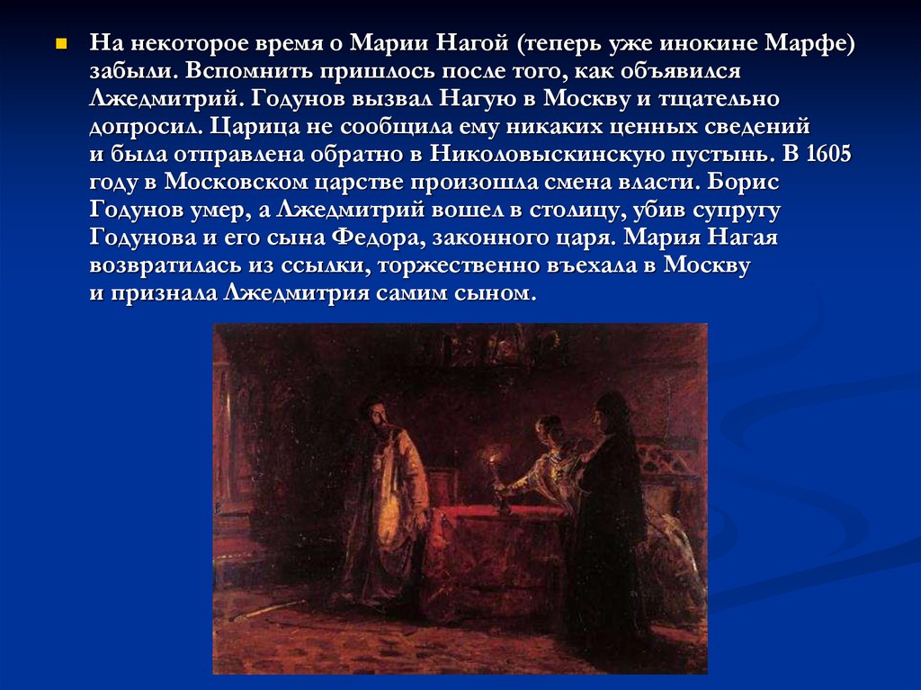 Лжедмитрий. Годунов вызвал Нагую в Москву и тщательно