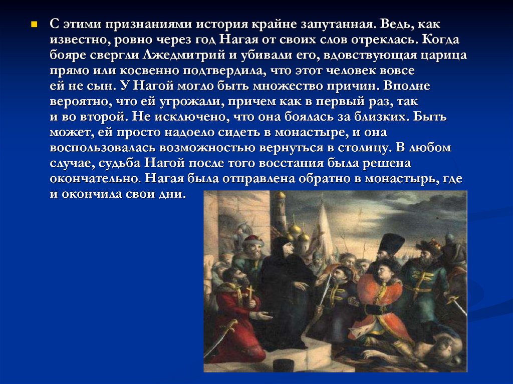 С этими признаниями история крайне запутанная. Ведь, какизвестно, ровно через год Нагая от своих слов отреклась. Когда