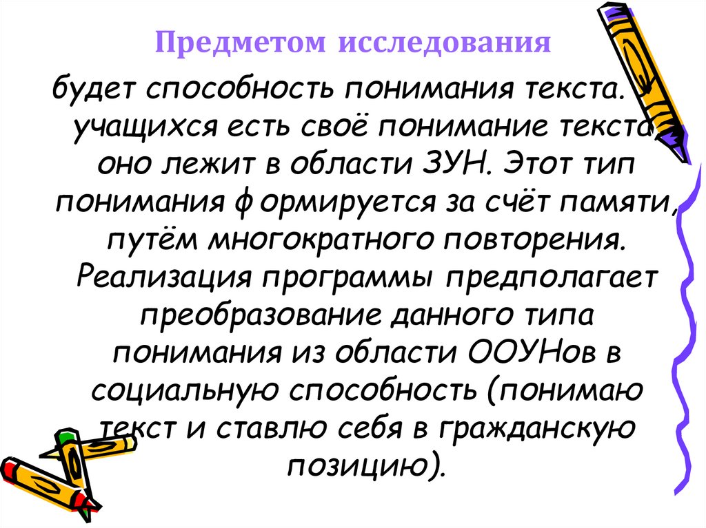 Предметом исследованиябудет способность понимания текста. У