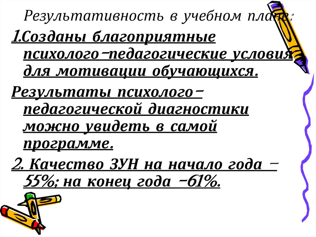 Результативность в учебном плане:1.Созданы благоприятные