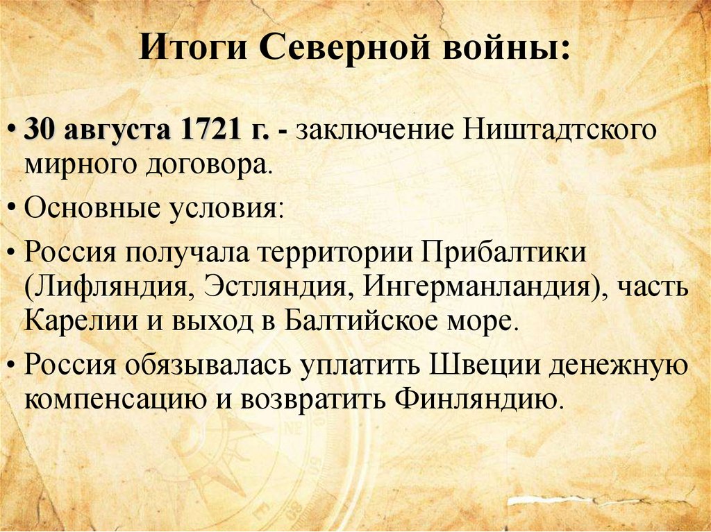 Итоги Северной войны:• 30 августа 1721 г. - заключение Ништадтского