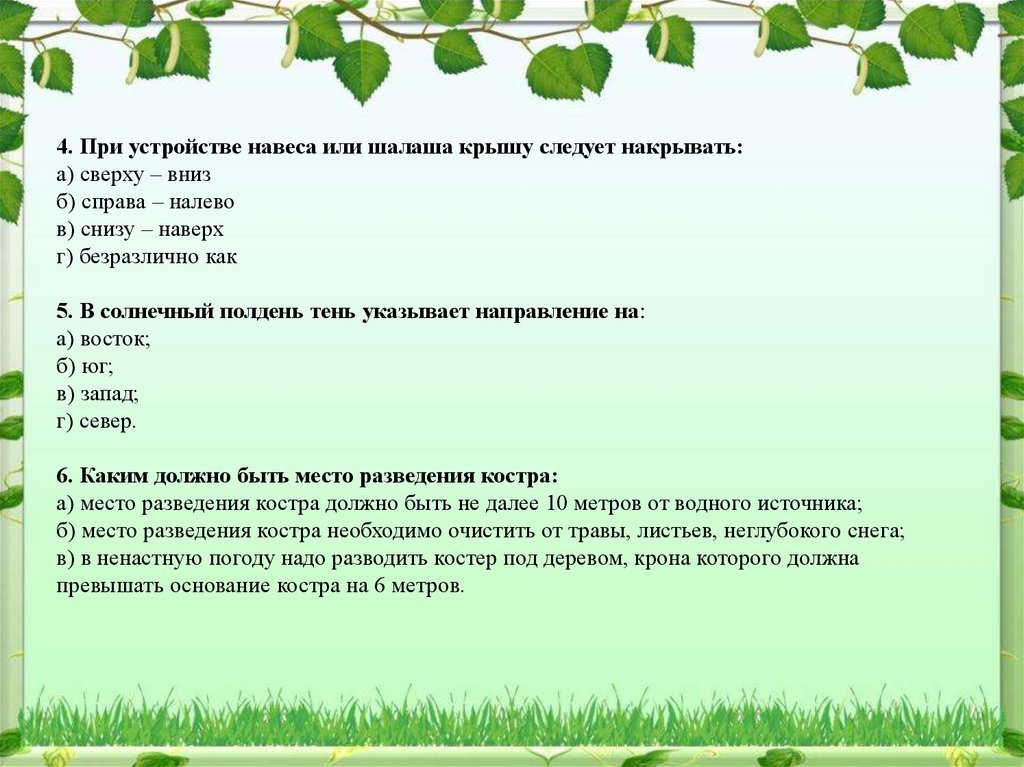 4. При устройстве навеса или шалаша крышу следует накрывать:а) сверху – вниз