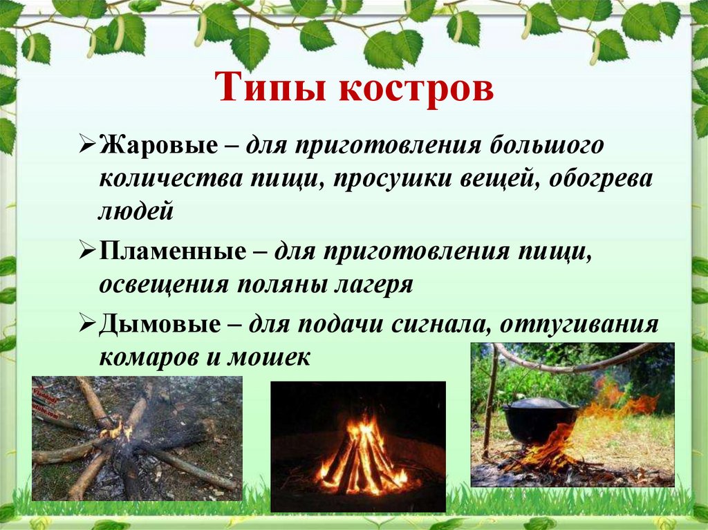 б) место разведения костра необходимо очистить от травы, листьев, неглубокого снега;