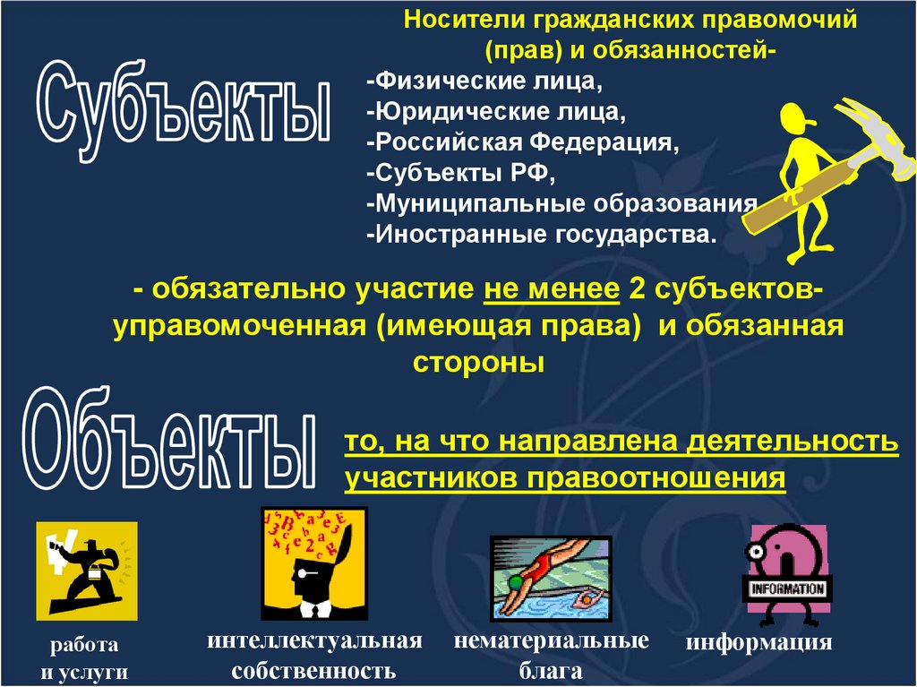 - обязательно участие не менее 2 субъектовуправомоченная (имеющая права) и обязанная