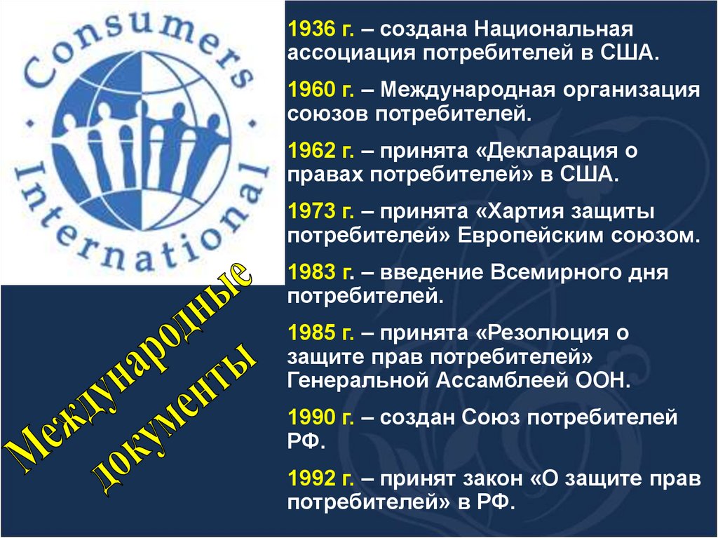 1936 г. – создана Национальнаяассоциация потребителей в США.