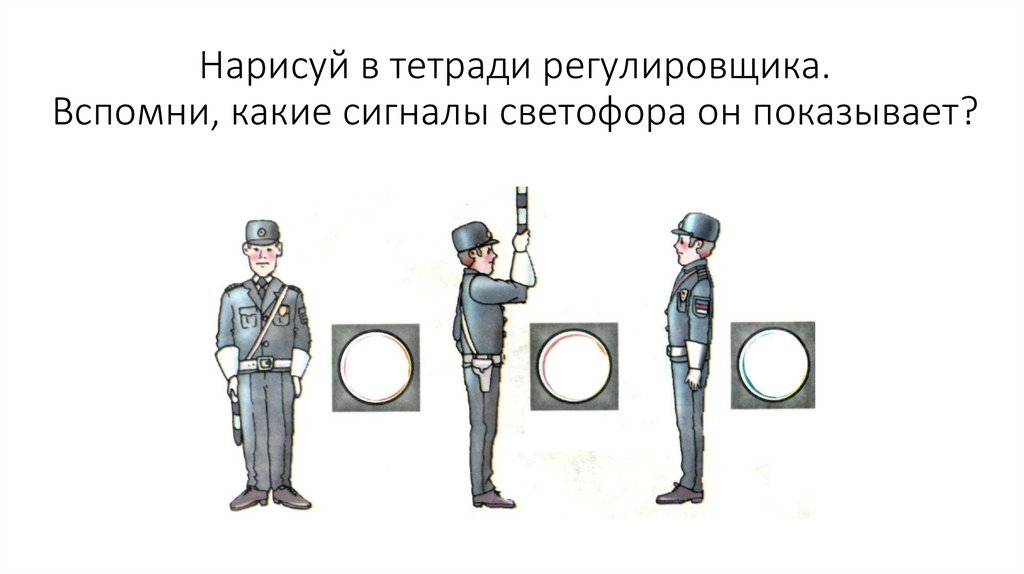 Нарисуй в тетради регулировщика.Вспомни, какие сигналы светофора он показывает?