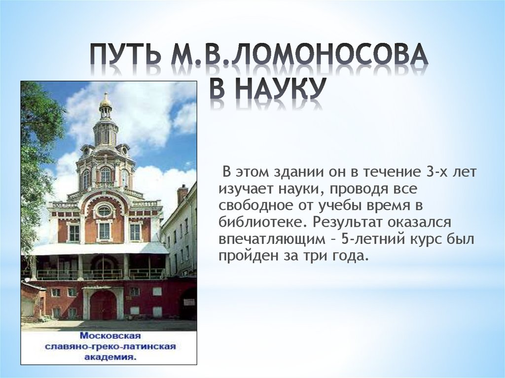В этом здании он в течение 3-х летизучает науки, проводя все
