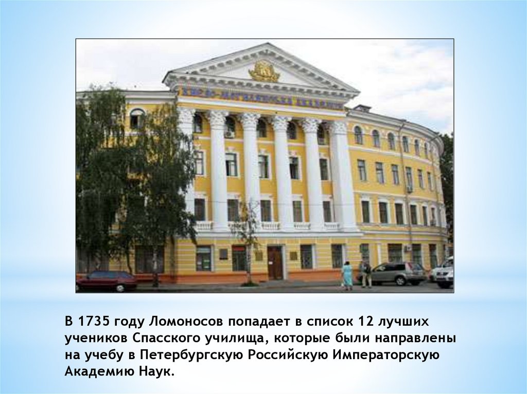 В 1735 году Ломоносов попадает в список 12 лучшихучеников Спасского училища, которые были направлены
