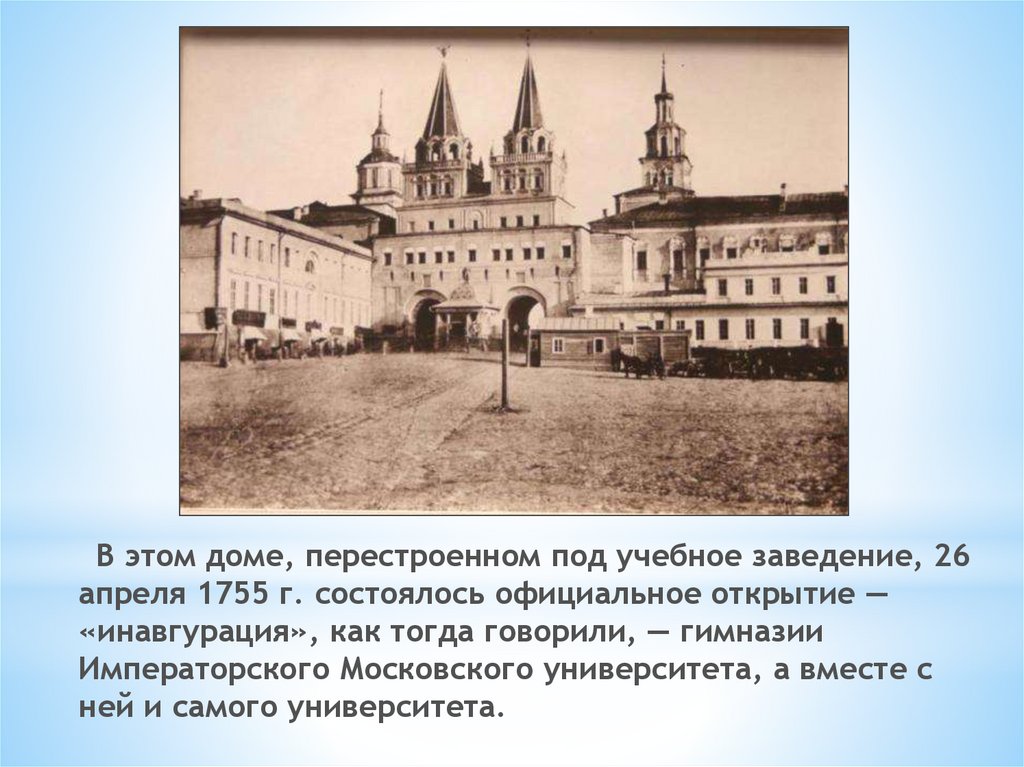 В этом доме, перестроенном под учебное заведение, 26апреля 1755 г. состоялось официальное открытие —