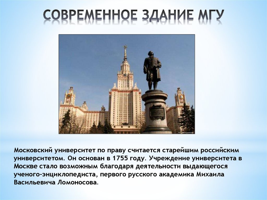 Московский университет по праву считается старейшим российскимуниверситетом. Он основан в 1755 году. Учреждение университета в