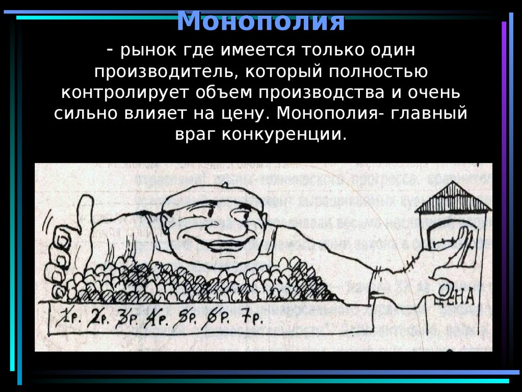 сильно влияет на цену. Монополия- главный