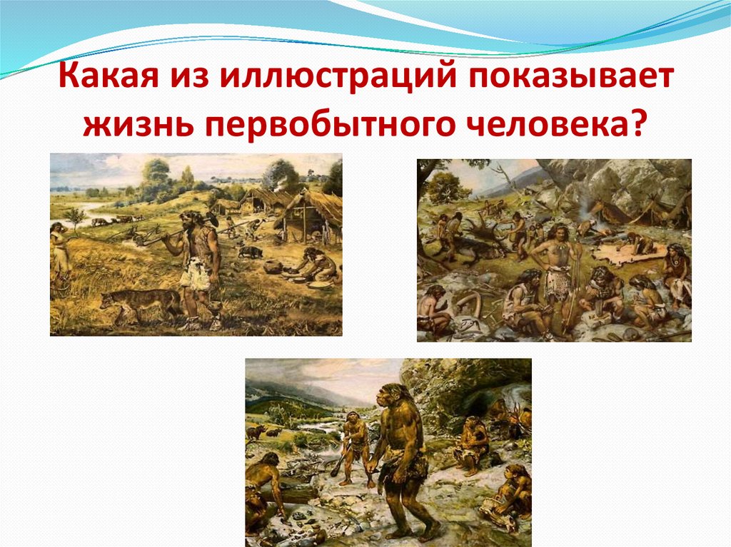 Какая из иллюстраций показываетжизнь первобытного человека?