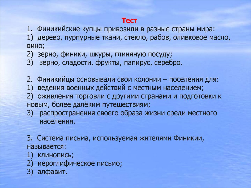 Тест1. Финикийские купцы привозили в разные страны мира: