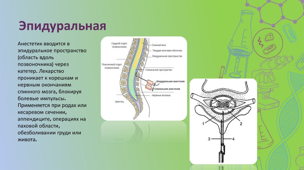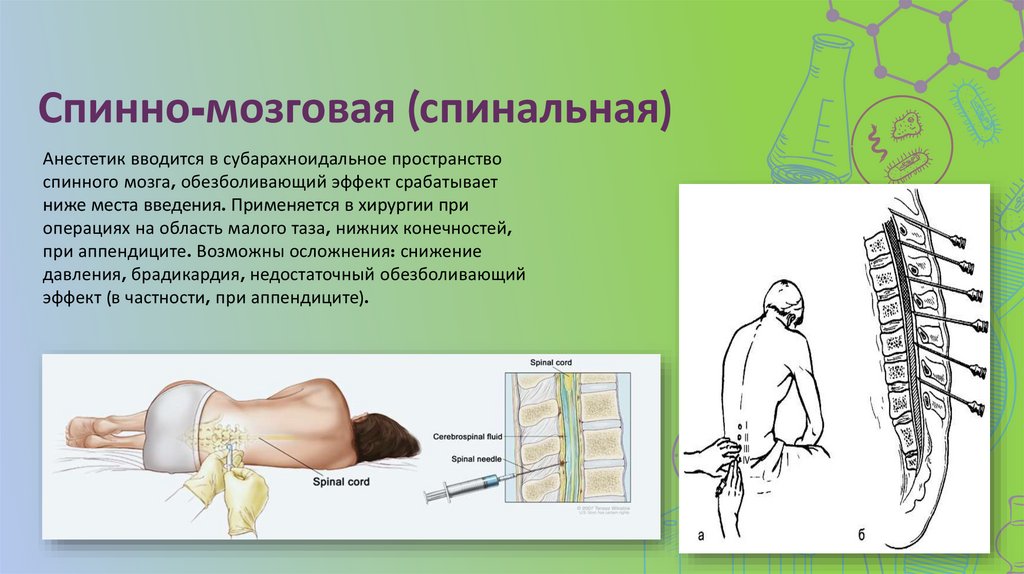 Спинно-мозговая (спинальная)Анестетик вводится в субарахноидальное пространство