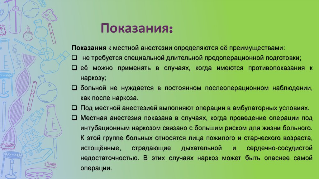 Показания:Показания к местной анестезии определяются её преимуществами: