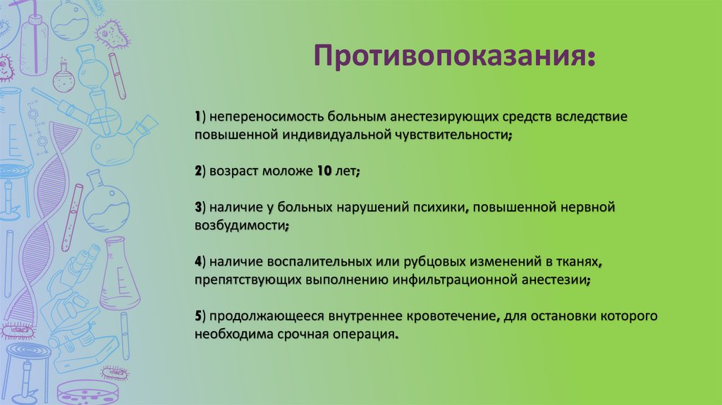 Противопоказания:1) непереносимость больным анестезирующих средств вследствие
