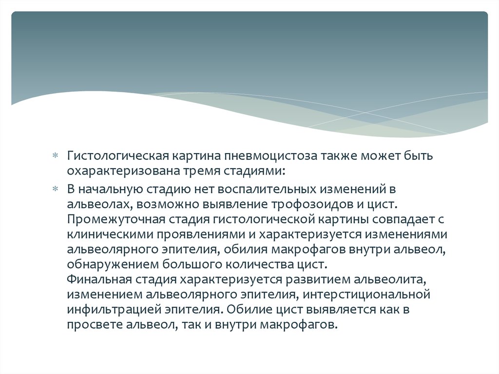 Гистологическая картина пневмоцистоза также может бытьохарактеризована тремя стадиями: