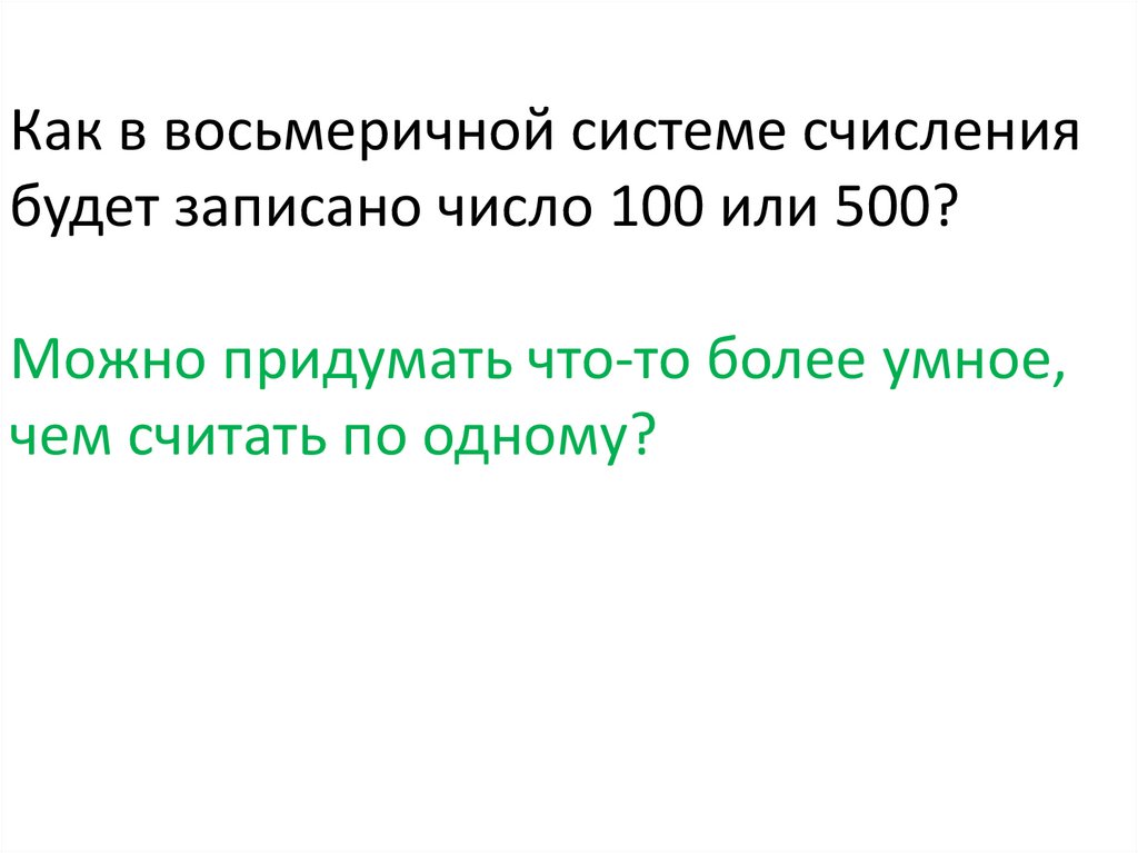 Как в восьмеричной системе счислениябудет записано число 100 или 500?