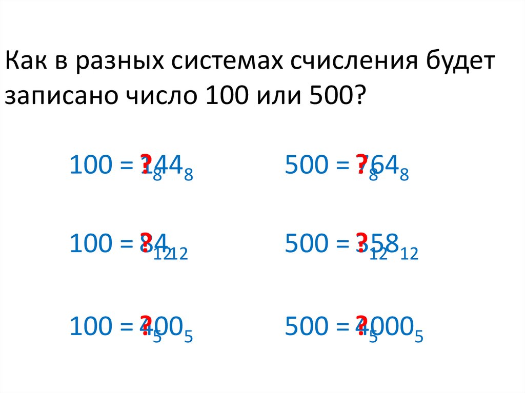 Как в разных системах счисления будетзаписано число 100 или 500?