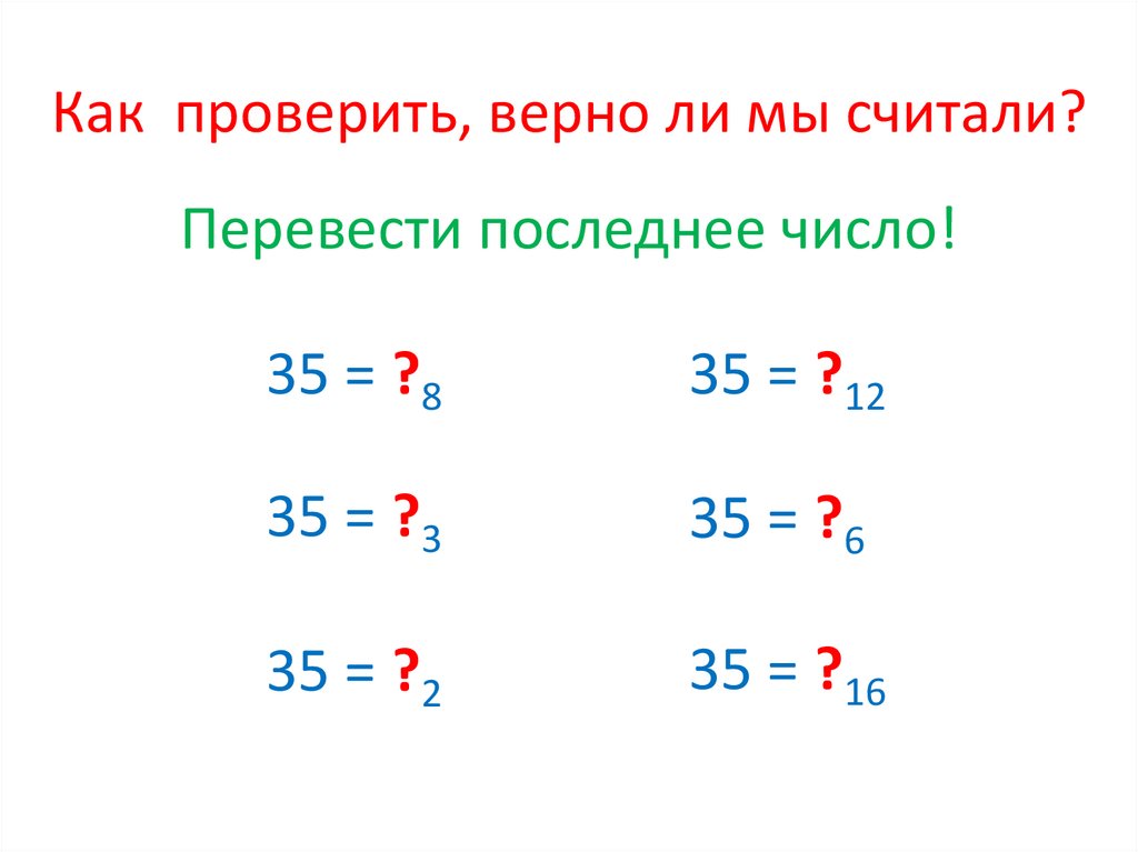 Как проверить, верно ли мы считали?Перевести последнее число!