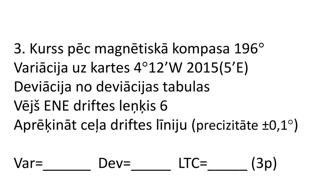 3. Kurss pēc magnētiskā kompasa 196Variācija uz kartes 4 12’W 2015(5’E)