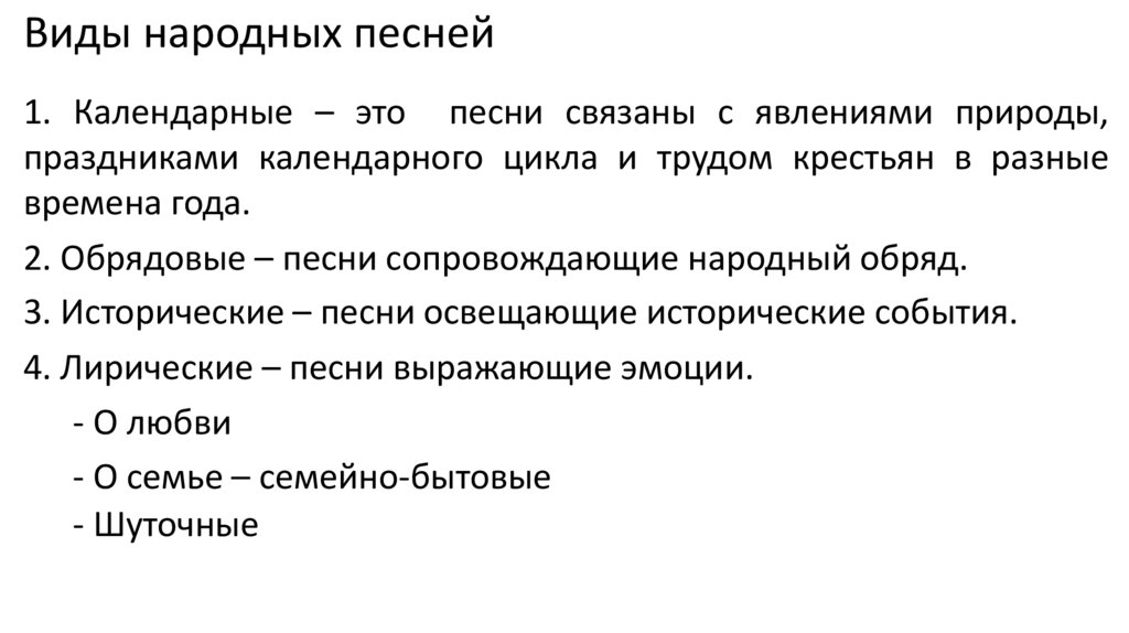 Виды народных песней1. Календарные – это песни связаны с явлениями природы,